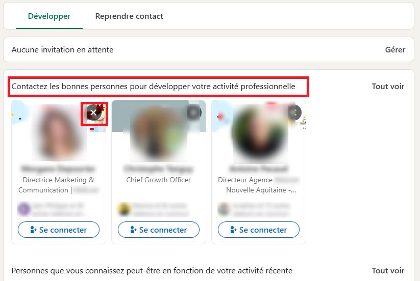 La section « Contactez les bonnes personnes pour développer votre activité professionnelle », c’est une super idée sur le papier. Mais quand tu contactes les 3 profils suggérés, qu’ils visitent ton profil sans accepter ta demande, on peut se demander si c’était vraiment des personnes pertinentes pour toi.