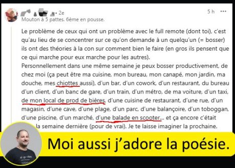 Tu sais pourquoi plus aucune entreprise ne veut faire de remote ? A cause des blaireaux dans son genre, adepte de la poésie. Car oui le mec adore bosser de ces chiottes, ça donne le ton 😀 j’espere juste qu’il ne met ni la cam ni le micro. Par contre quand il bosse depuis un […]