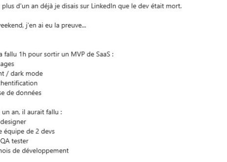 Je lance un challenge aux (prétendus) devs IA qui codent en 1 jour ce qu’il faut 60 jours à faire : montrez-moi le résultat ! Parce que dire à tout-va : les devs sont morts, l’IA fait tout, je peux te faire ton SaaS en 1 jour, mais sans rien montrer, est juste un énorme […]