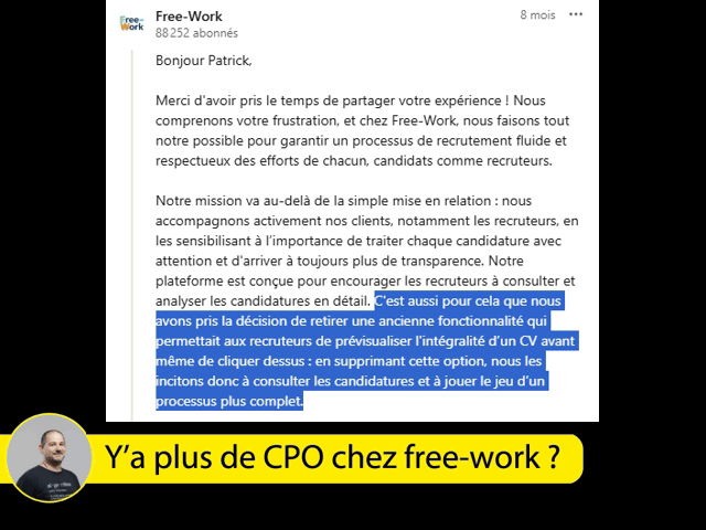 Ah peut être que si il a lu une fois ton cv, alors Free-work considère qu’il te connait, même si tu postules 6 mois après, ou alors le recruteur a reposé la même annonce et donc pour ce poste t’a déjà été étudié, bref rien n’est clair.